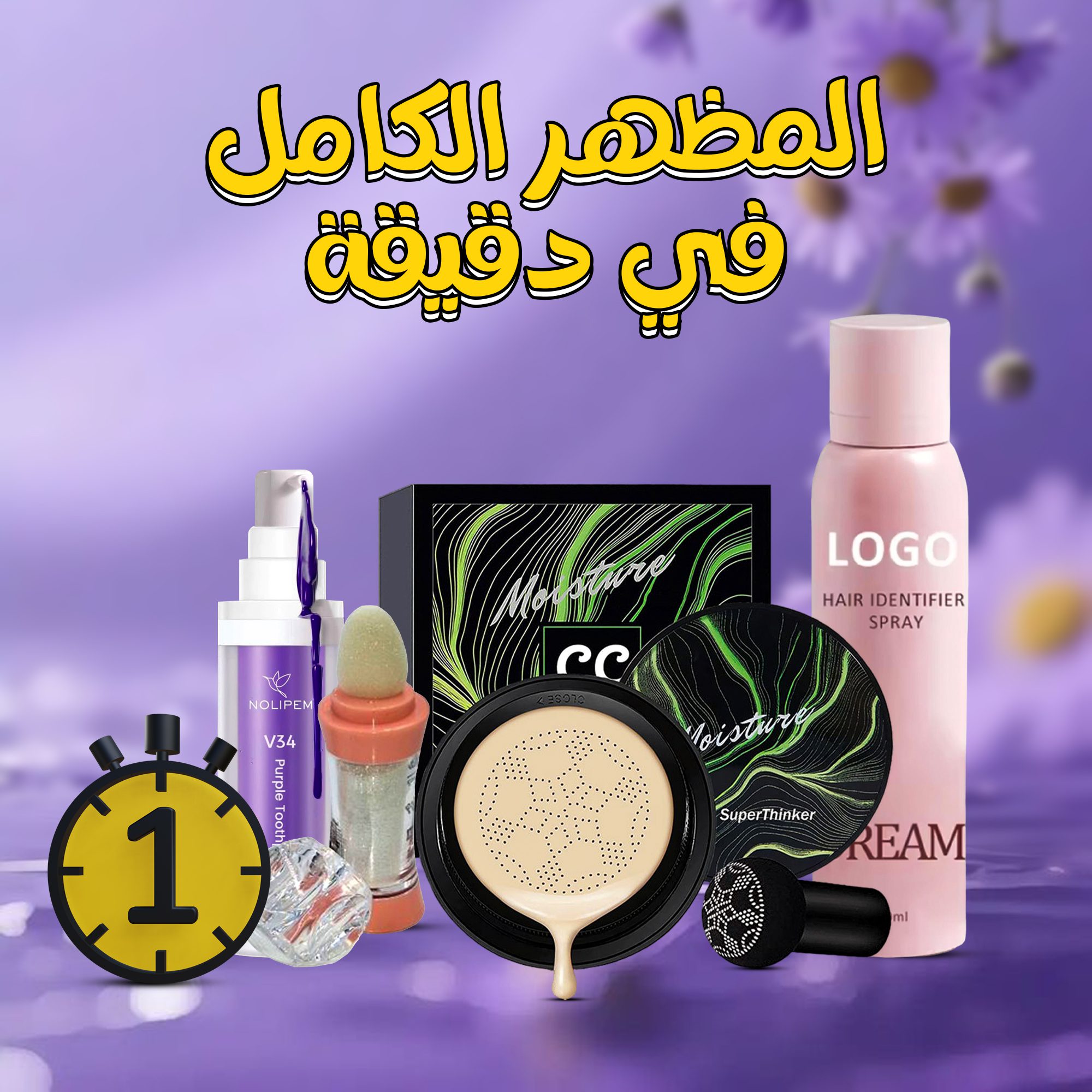 المظهر الكامل في دقيقة (جيل تبييض وتنظيف الاسنان السحري هدية+كريم الأساس الفلتر+سبراي تحديد شعر الوجه والجسم+هايلايتر الوجه يإسفنجة)