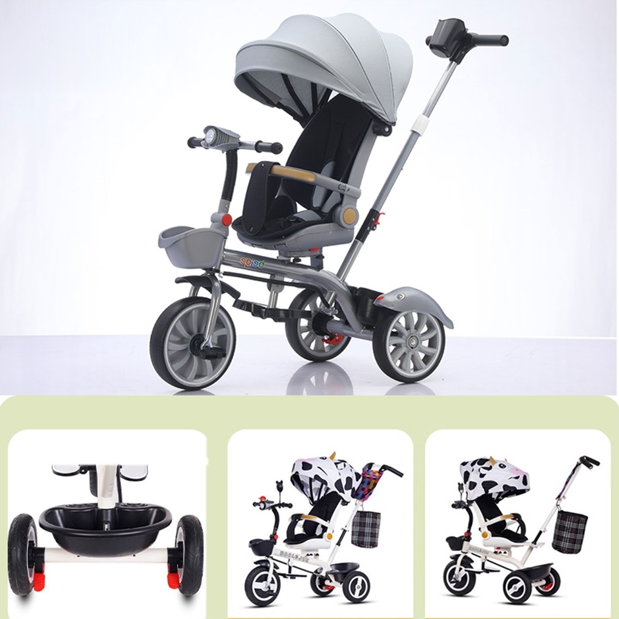 1× دراجة أطفال ثلاثية العجلات بمظلة ومقبض دفع