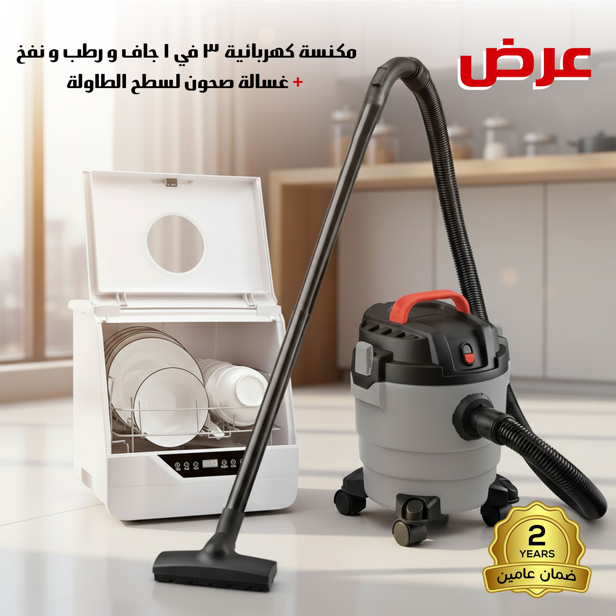 عرض مكنسة كهربائية 3 في 1 جاف ورطب ونفخ ضمان عامين + غسالة صحون لسطح الطاولة بضمان عامين