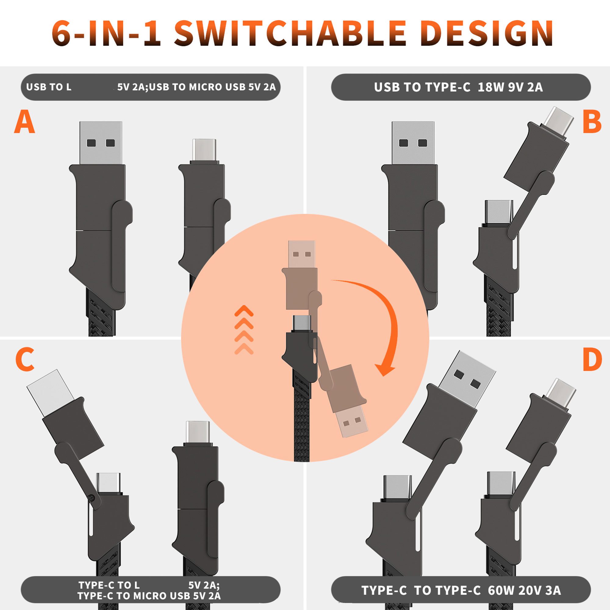 كابل شاحن متعدد الاستخدامات 6 في 1
